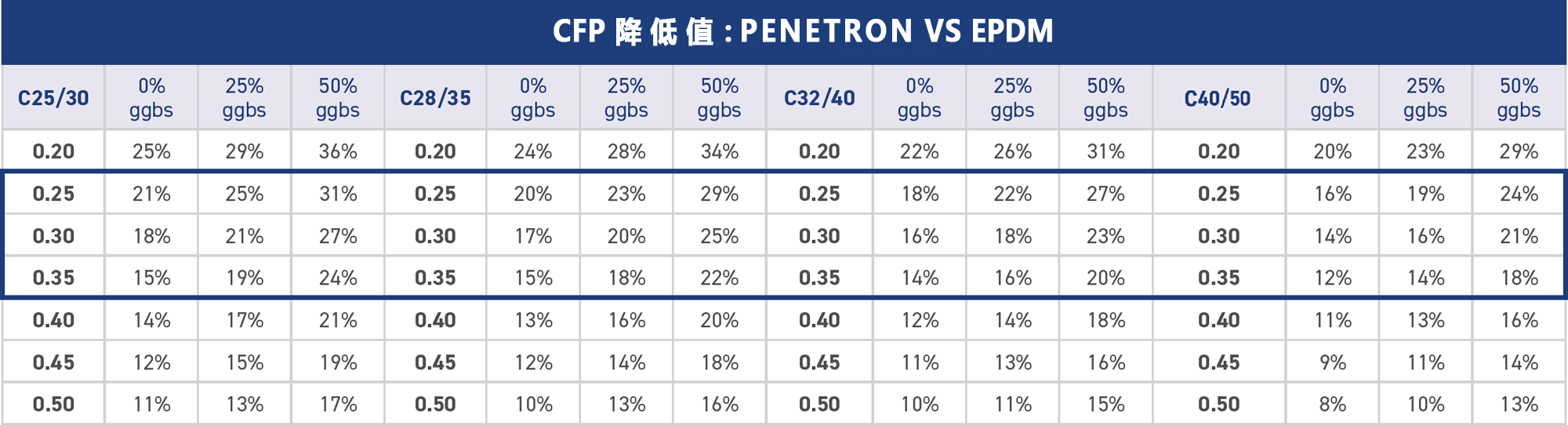 按照結(jié)構(gòu)平均厚度0.25-0.35m計算每平方米混凝土的CFP,將PENETRON ADMIX 澎內(nèi)傳混凝土防水添加劑(PNC803)與上述表面處理方案進(jìn)行比較?,結(jié)果見右表。